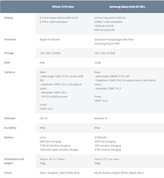 Nhưng một trong những thiết bị tốt nhất của Android được so sánh như thế nào với Apple? Để có cái nhìn toàn diện hơn về bộ đôi đối thủ này, chúng ta cần xem xét tất cả các khía cạnh như thông số kỹ thuật, thiết kế, cấu hình và giá cả...Dưới đây là một cái nhìn nhanh và chi tiết về iPhone 12 Pro Max và chiếc điện thoại Samsung chính hãng Galaxy Note 20 Ultra, mời tham khảo!